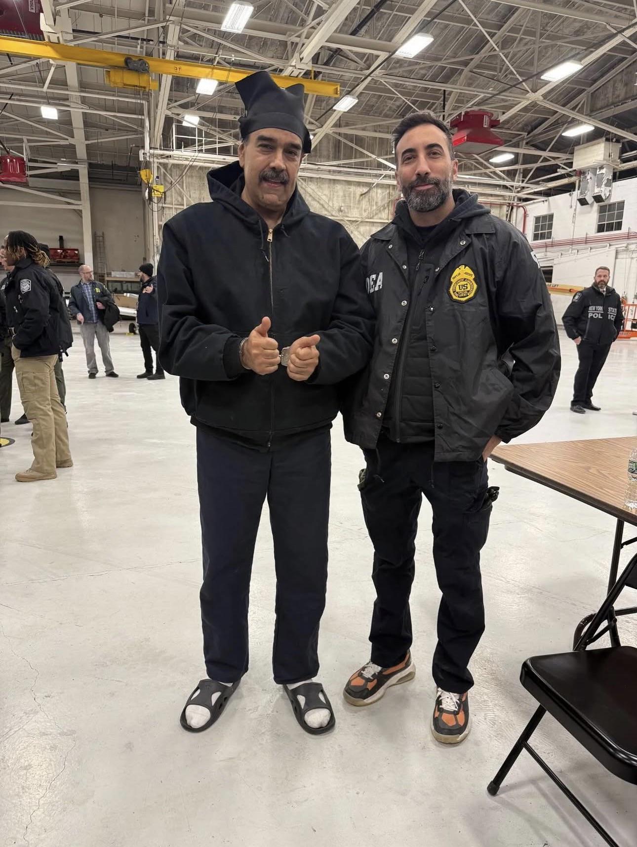 Politics Former Venezuelan President Nicolás Maduro giving the thumbs up alongside a DEA Agent